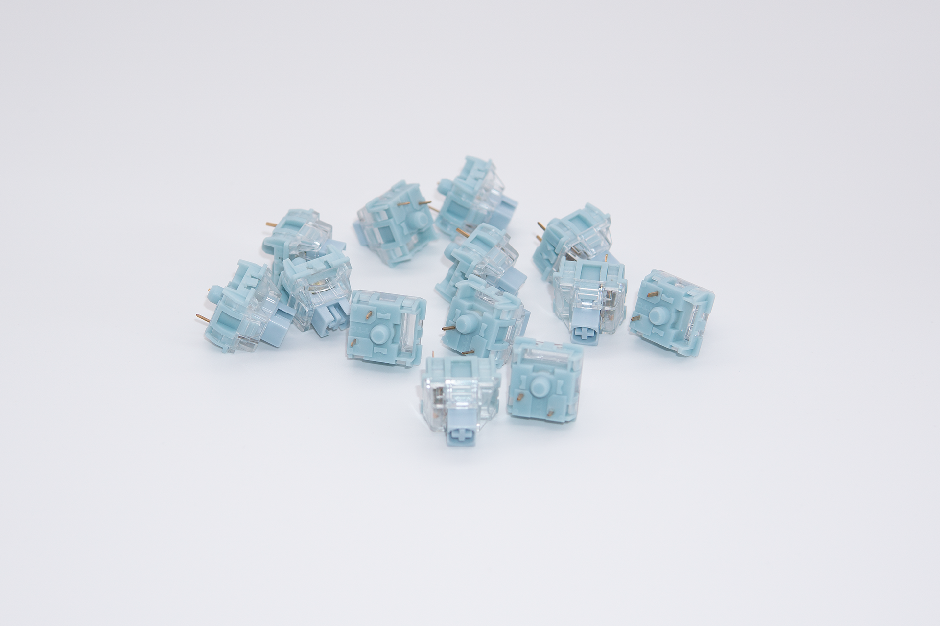 Produced by TTC, bluish whites are a lovely shade of blue, and offer a mild tactile bump about 0.5mm into travel. This combined with the muted bottom out and low spring weight make for a very unique tactile experience.